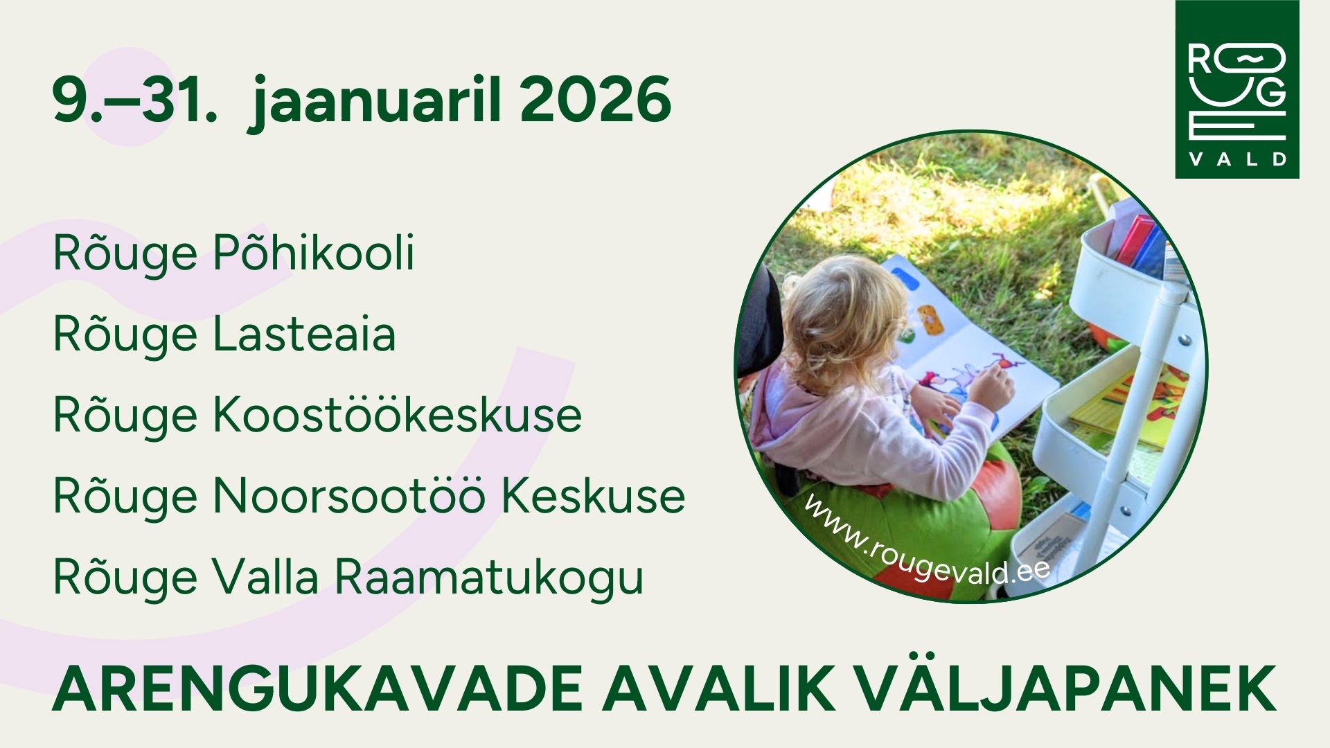 9.-31. jaanuarini 2026 on avalikul väljapanekul Rõuge Põhikooli, Rõuge Lasteaia, Rõuge Koostöökeskuse, Rõuge Noorsootöö Keskuse ja Rõuge Valla Raamatukogu arengukavad.